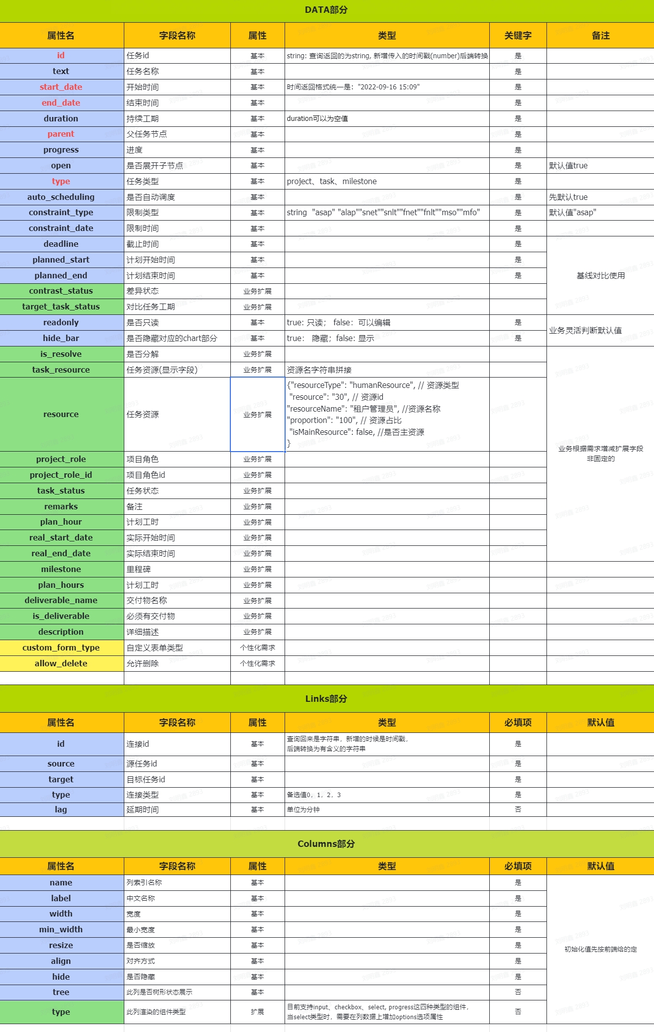 ]下图中蓝色背景的为 DHTMLX GANTT 需要的字段,具体可以看看 DHTMLX 官网说明。